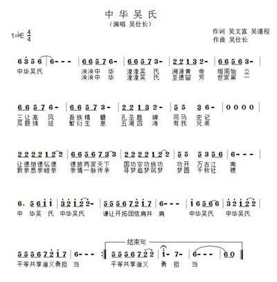 ◎中华吴氏之歌非同凡响!扬我吴氏之风采,为吴氏永世传承之盛事! --吴光美原《重庆日报》记者。