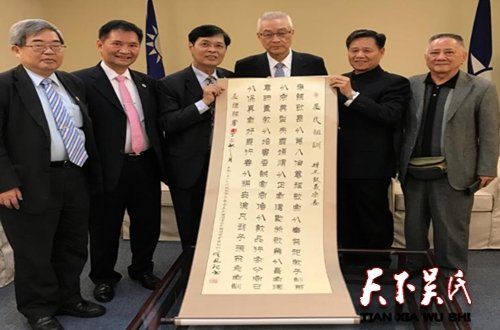 天下吴氏讯(吴蜀丰特约撰稿海韵) 原标题《吴伯雄宗长 吴敦义宗长 收藏吴凤银吴体隶书》2018年3月28日上午,原世界吴氏宗亲总会二届主席吴良民、厦门市吴文化研究会会长吴国荣博士、台湾桃园吴姓宗亲会顾问吴国祯、东莞吴氏宗亲会荣誉会长吴铭煜、厦门吴氏宗亲会顾问吴燿旭,拜访中国国民党荣誉主席吴伯雄。拜访中,吴良民向吴伯雄宗长赠送了由中国黑龙江吴风银(又名吴凤银)创立的吴体隶书书法作品以及吴凤银的行草作品“德”。