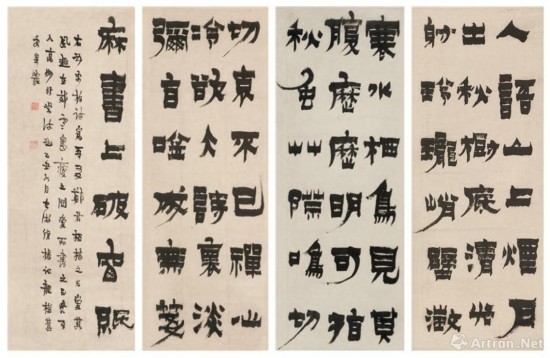 金农的漆书,在金农各类书法作品中最为“前卫”。金农50岁赴京参加博学鸿词科考试时,受到当朝书坛泰斗张照的激赏,他书动京华,成为当时隶书的第一流高手。但由于落榜,归来途中思想发生了逆转,以后作为汉隶特征的隶书作品在金农手下消失了,代之以一种变体的隶书,后世人称金农这种体为“漆书”。
