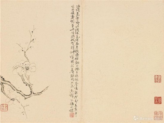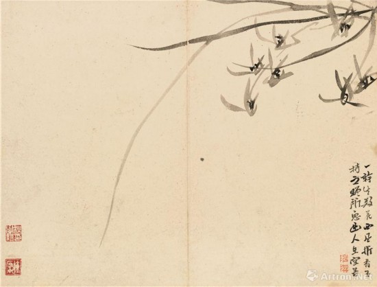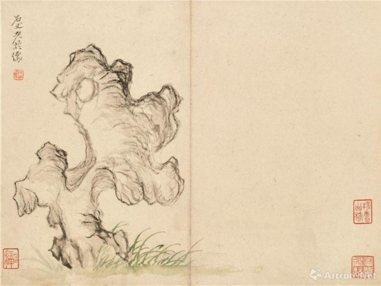 陈撰(1678—1758)浙江人人,早年受业于毛奇龄,诗文书画俱工,又精于碑版古籍之鉴定。中岁流寓扬州。他为人清高,不轻易为人作画,故有“每纸落人间,珍若拱璧”之谓。传世作品不多,且大都为册页小品。萧平老师认为,陈撰是“八怪”中画笔最为简略的一人,往往仅在纸素一角作画,留其大部空白,属于纯粹的文人墨戏。