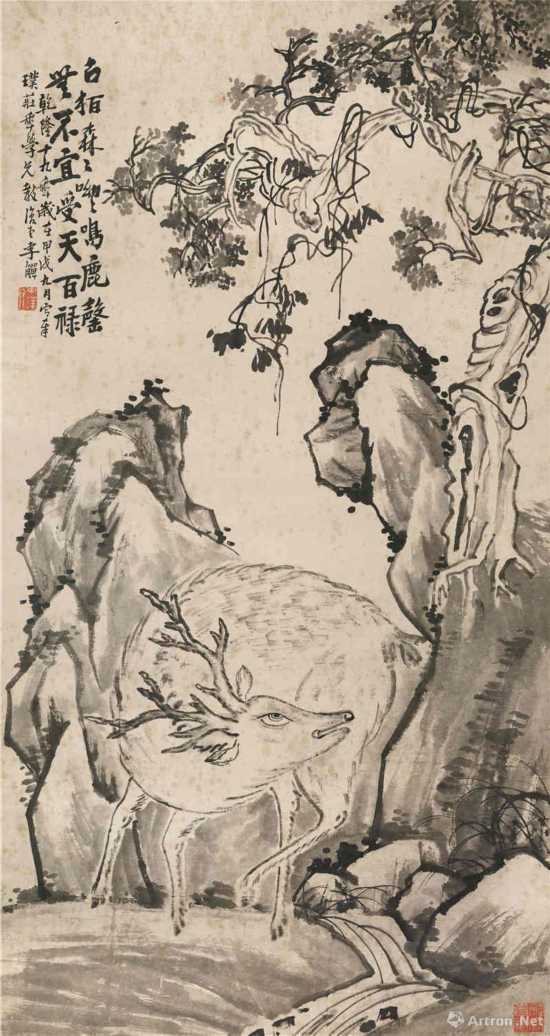 李鱓 《古柏鸣鹿图》轴 142×76cm 纸本水墨