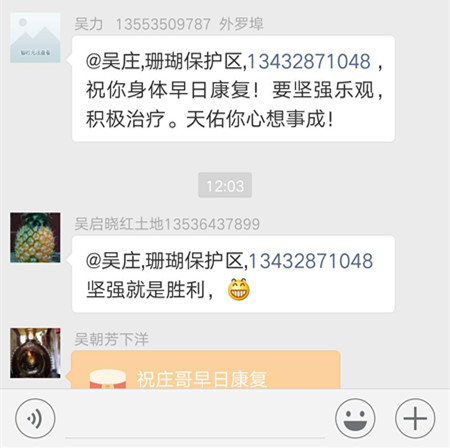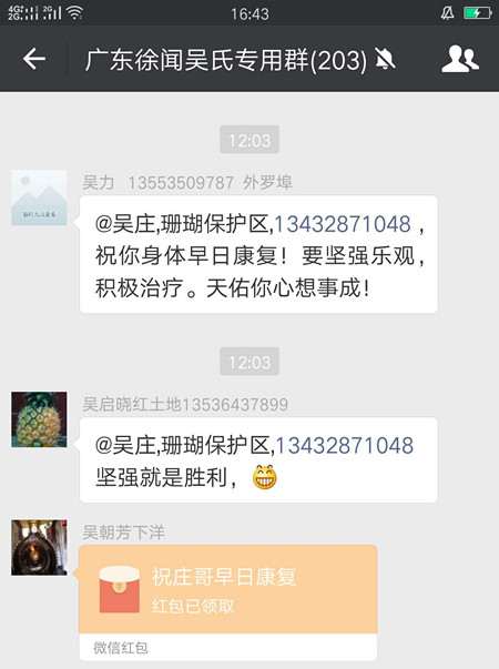 3月底,广东徐闻籍宗亲吴庄突患重病症,住进广州中山附属肿瘤医院,急需大笔费用治疗。吴志达宗亲获知后,第一时间来到医院探望,并联系徐吴会商议捐款事宜。徐闻县吴文化研究会获知详情之后,由吴世魁宗亲执笔,第一时间在“广东徐闻吴氏专用群”发布倡议,组织宗亲捐款活动。