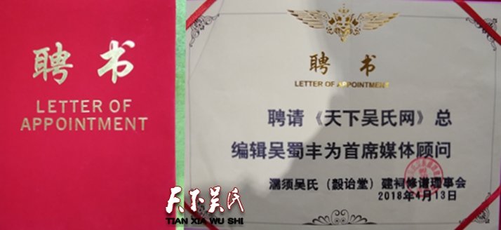 大家相见恨晚,情投意合,经吴永今宗长当场提议,濡须吴氏(穀诒堂)宗亲理事会愿与天下吴氏网结成战略联盟,同时本人被聘请为首席媒体顾问为濡须吴氏传承家风传递正能量。