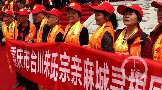 来自重庆合川的朱氏家族一行12人在活动祭祖大典门前拉着“重庆合川朱氏宗亲麻城寻根团”的条幅合影留念,与其他姓氏不同的是,和他们一起合影的还有麻城当地朱氏的朱金明。他们是2012年从重庆合川寻根到了湖北麻城,并成功续上了族谱。