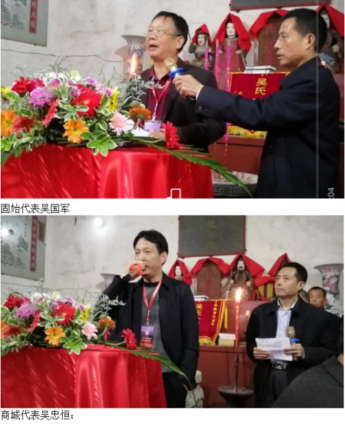 原来,元末明初兴化军司狱吴思贤祖居江西饶州府鄱阳县瓦屑坝筷子巷。长子吴文盛,世袭武职。以军功加太子少保、后军都督,武昌总兵。时值在鄱阳湖至武昌一线与徐寿辉、陈友谅打仗,兵陷武昌,由白马驮谱渡江,落难大别山金刚台下,后辗转至金寨南溪吴家湾猪头山下,死葬于此。其后裔繁衍至湖北的麻城、罗田;河南的固始、商城、淮滨、潢川;安徽的金寨;山东的历城等地,后裔达几万人。吴文盛因是元朝官员而成追逃对象,躲避深山,不敢与江西老家往来久而失联。其弟吴敬堂也从当时的移民集散地离开原居地,移居庐山脚下的吴淇湾。双方后人在口口相传和先辈嘱托下,苦苦的寻家与寻根。不意2017年盛夏,吴敬堂第20世裔孙吴声楠一行五人再度来到河南固始,在双方谱牒对照中误打误撞,有了十分惊人的发现和吻合。后又三度抵达金寨、商城交流论证,终于有了初步的共识。真成就了2018年4月14日的伟大成果和空间盛世。