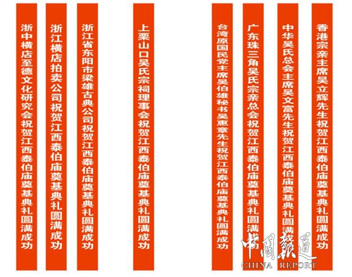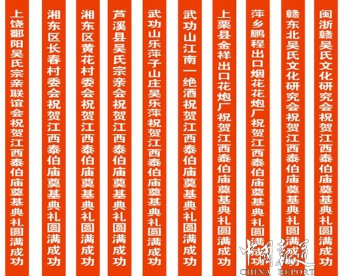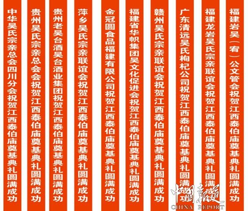 中国报道(吴蜀丰江西报道相约江西萍乡为泰伯庙奠基“添砖加瓦”的邀请函发岀以来至今,受到全国各地吴氏宗亲及海外宗亲的关注,我们在此表示衷心感谢并真诚期待你的光临!现将4月26日(农历三月十一日)参加的祝贺部分单位公示如下(排名不分先后);名单更新中。
