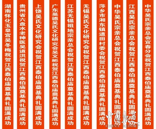 中国报道讯(吴蜀丰江西报道)相约江西萍乡为泰伯庙奠基“添砖加瓦”的邀请函发岀以来至今,受到全国各地吴氏宗亲及海外宗亲的关注,我们在此表示衷心感谢并真诚期待你的光临!现将4月26日(农历三月十一日)参加的祝贺部分单位公示如下(排名不分先后);名单更新中。