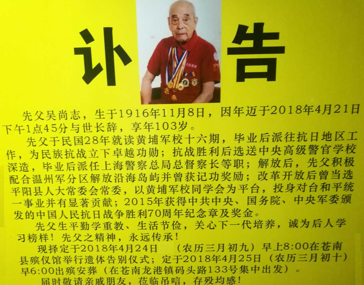 浙江温州苍南县龙港抗战老兵吴尚志宗长于4月21日下午1时45分于龙港逝世,享年103岁