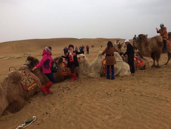 虽然下雨,但游人依然兴趣盎然地走进骑骆驼的活动区域,一对对的驼群由牧民牵拉着,一步一步走向大沙漠的深处......。此时亦有部份人参加沙丘滑板运动,从高高的沙丘上坐上专用的滑沙板,从高处滑落而下,趣味无穷,人们几乎忘记了天还在下雨。