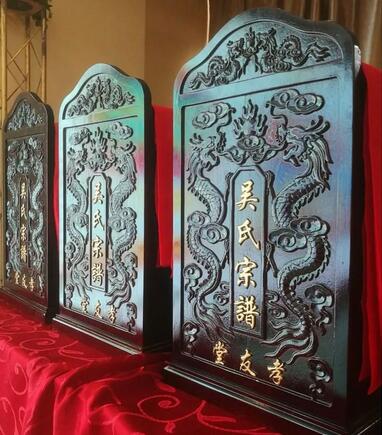 新修的谱书装在木质盒子里。盒子正面雕刻着祥云和两条龙,还刻有“吴氏宗谱“、“孝友堂“金色大字。盒子上面披盖着红绸布。显得庄重、大气、典雅。每位请谱者,先向三圣公像三鞠躬,再像谱书三鞠躬,然后将装着谱书的木盒子双手捧着下去。