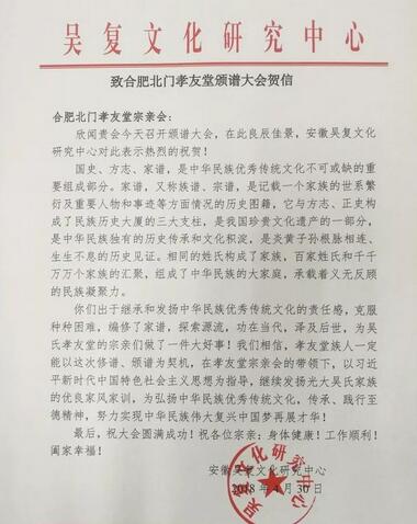 孝友堂颁谱大典得到全省各地吴氏宗亲理事会的祝贺,他们纷纷向大会赠送锦旗、书法作品,发来贺信。有九华山老田吴宗亲理事会、安徽吴复文化研究中心、怀宁观乐堂宗亲理事会、岳西县吴氏宗亲理事会、肥东吴巷三让堂宗亲理事会、舒城缵陵堂宗亲理事会、合肥包冲三让堂宗亲理事会、合肥前份三让堂宗亲理事会、合肥至德堂宗亲理事会、淝河耘经堂宗亲理事会、合肥耕礼堂宗亲理事会等。