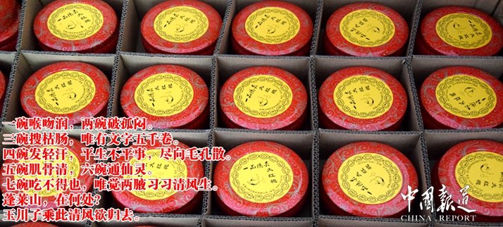 《七碗茶》唐·卢仝 “一碗喉吻润,两碗破孤闷。三碗搜枯肠,唯有文字五千卷。四碗发轻汗,平生不平事,尽向毛孔散。五碗肌骨清,六碗通仙灵。七碗吃不得也,唯觉两腋习习清风生。蓬莱山,在何处?”《七碗茶》译文:玉川子乘此清风欲归去。喝第一碗茶时喉中感到滋润;第二碗消除了心中的孤单烦闷;第三碗感觉自己才思枯窘,开始搜寻思考新的学问;第四碗喝出轻汗,不平的牢骚,随汗散尽;第五碗神清气爽;第六碗能与神仙沟通;第七碗喝罢,感觉自己超凡脱俗,两腋习习风生,要飞到蓬莱山去了。