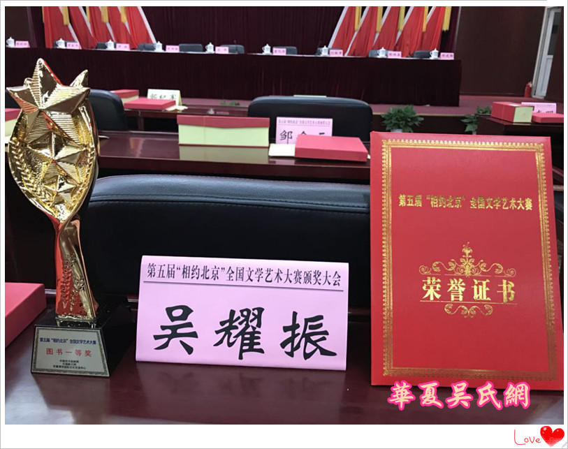 4月30日上午8点首先进行全体参会人员“全家福”的合影,大家在飯店门前广场排队等候负责颁奖的将军级、部长级首长的到来。首长8点准时到场,摄影师立即抓紧时间进行拍摄,拍摄结束,首长和代表们一一走上设在五楼的会议大厅。进入大厅看到巨大横幅写着:第五届“相约北京”全国文学艺术大赛颁奖大会的鲜艳大字。上午9时正式颁奖,获奖人员分批走上主席台接受中央部级领导的颁奖。广西荣获一等奖的吴耀振先生列队在第三批(25号排位)走上主席台接受中国人民武警总部政治部原副主任、中国炎黄文化研究会常务副会长张补旺少将的颁奖。吴耀振获一等奖的题目是小说图书《吴授按的风雨人生》。为了分享吴耀振先生获奖的快乐和荣耀,吴授安、吴大友宗亲陪同赴京领奖。