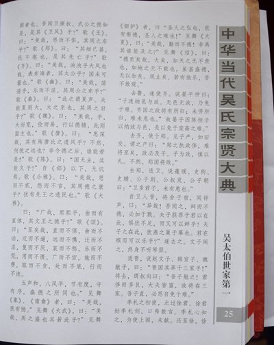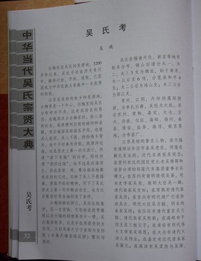 《大典》系吴氏家族史籍。收录范围不受旧的传统观念束缚,既收录吴氏中省军级以上高官名将,又收录造福一方的地方科局级及相当此级职称(均含副职)以上的中层人士;既收录吴氏中名闻遐迩的教授、专家、学者、高级文化科研人员和国营与民营企业家,又收录对国家、社会有一定贡献的族彦乡贤,同为一个目的:彰表贤士,激励后人。