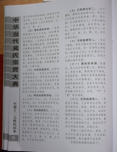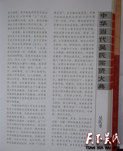 《大典》系吴氏家族史籍。收录范围不受旧的传统观念束缚,既收录吴氏中省军级以上高官名将,又收录造福一方的地方科局级及相当此级职称(均含副职)以上的中层人士;既收录吴氏中名闻遐迩的教授、专家、学者、高级文化科研人员和国营与民营企业家,又收录对国家、社会有一定贡献的族彦乡贤,同为一个目的:彰表贤士,激励后人。