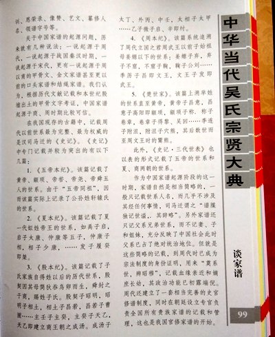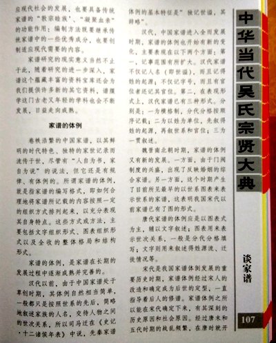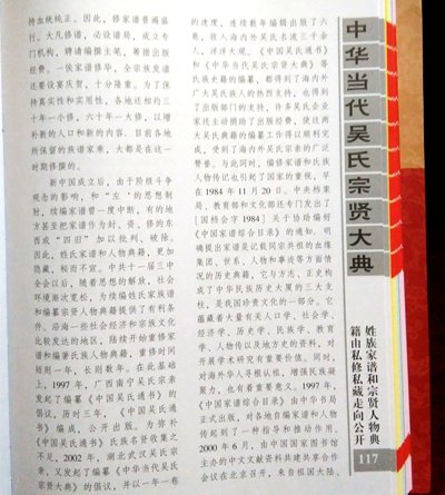 《大典》系吴氏家族史籍。收录范围不受旧的传统观念束缚,既收录吴氏中省军级以上高官名将,又收录造福一方的地方科局级及相当此级职称(均含副职)以上的中层人士;既收录吴氏中名闻遐迩的教授、专家、学者、高级文化科研人员和国营与民营企业家,又收录对国家、社会有一定贡献的族彦乡贤,同为一个目的:彰表贤士,激励后人。