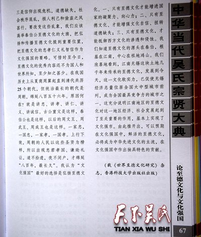 天下吴氏讯(吴蜀丰)【编者按】本期推荐文章:《谈家谱》。《姓族家谱和宗典人籍由私修私藏走向公开》作者吴洪激。《至德论与文化强国》作者吴洪激。《文化分源走向文化趋同》作者吴洪激。