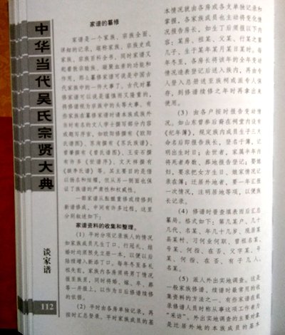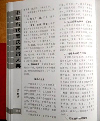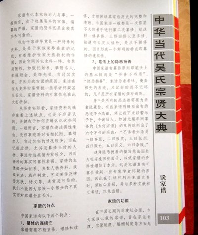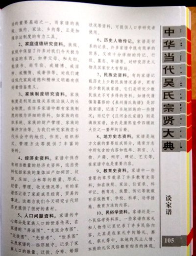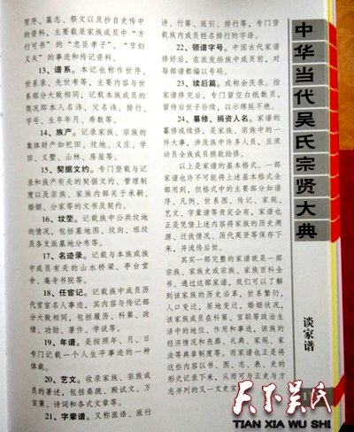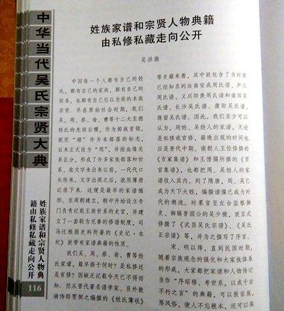 《大典》系吴氏家族史籍。收录范围不受旧的传统观念束缚,既收录吴氏中省军级以上高官名将,又收录造福一方的地方科局级及相当此级职称(均含副职)以上的中层人士;既收录吴氏中名闻遐迩的教授、专家、学者、高级文化科研人员和国营与民营企业家,又收录对国家、社会有一定贡献的族彦乡贤,同为一个目的:彰表贤士,激励后人。