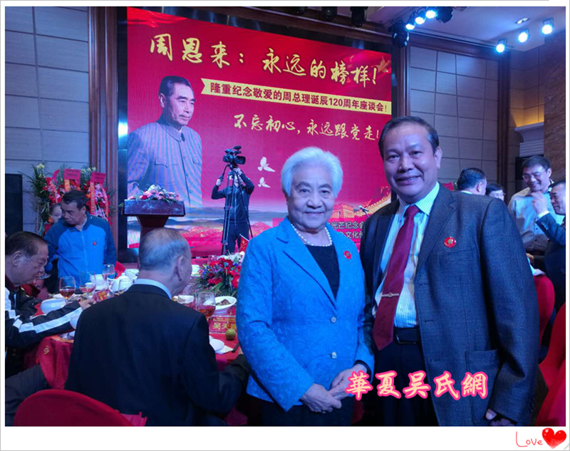 吴乙先宗亲有幸受邀参加在深圳举行的周恩来总理诞辰120周年纪念大会,在大会上受到原国务院副总理吴桂贤宗姐的亲切接见,并合影留念。这是他个人的光荣与幸福,也是吴氏族人的光荣和幸福。会议期间吴乙先宗亲代表柳州吴氏联谊会赠送《吴氏情緣》和《东泉镇吴氏风采》两本书给吴桂贤宗姐。吴桂贤宗姐高兴地收下这两本家书,认真翻阅后对吴乙先说:你们家乡柳州市的吴文化工作搞得不错,方便的时候我去柳州看看。吴乙先兴奋地说:欢迎!欢迎!