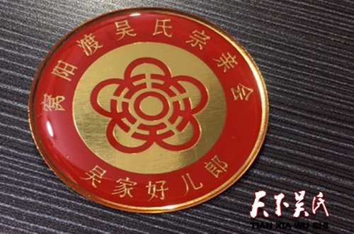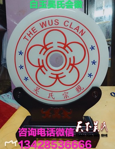 【吴氏会徽】吴氏会徽是泰伯至德精神的象征和中华吴氏的标志,自然成为吴氏国际性标志。泰伯生前性喜种梅,以五吴同口组成的梅花图案。寓意吴人缅怀祖先和发祥地无锡梅里。梅花的五片花瓣寓意着中国五湖四海,世界五大洲吴氏子孙同宗共祖,象征着吴氏族人心连着心,手牵着手,象征着吴氏族人的团结一致,和谐共荣,开拓奋进。梅花五瓣象征五福,形成吴字,吴家世世代代,子子孙孙,五福绵延。会徽的颜色,无论是黄底红花,还是红底黄花,单纯而强烈的色彩,都象征着吴氏族人的光明、喜庆与兴旺。外圆形似日月,像征泰伯后裔兴旺发达,前程与日月同辉。也暗含着颂扬先祖至德,“帝王之首”,“世家第一”的深意。梅花与吴氏族徽,更体现了民族之精华,值得族人,国人之尊祟。愿梅花清香永流芳,吴氏家风代代传。全国吴氏宗亲组织,经常授于表彰宗亲会内有突出贡献的宗亲,荣获吴氏会徽是宗亲组织中最高的荣耀。吴氏会徽有合金铸造,玉石彩雕,高级水晶,传家之宝,值得珍藏,贵重之作。直径20-38厘米,净重3-5.8公斤。
