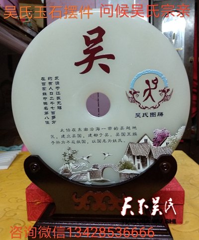 吴氏图腾、吴氏会徽,适合摆放办公桌、客厅、祠堂、酒柜、装饰柜。吴氏图腾玉石摆件,白玉吴氏会徽,全国统一价398元,内含寄费,偏远地区另加快递费。