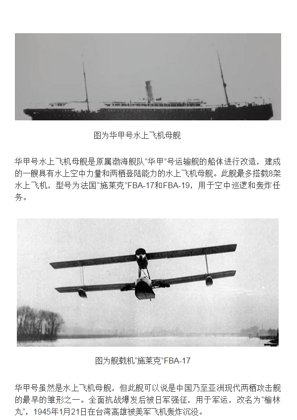 渤海舰队的“华甲”号运输舰, 原是“中国”号奥匈帝国商船,后由东北联合舰队改造为水上飞机母舰。此舰最多搭载8架水上飞机,型号为法国“施莱克”FBA-17和FBA-19,用于空中巡逻和轰炸任务;238人基础舰员,常备200支步枪和14艘汽艇;最多可舰载1000名左右士兵用于登陆作战。此舰可以说是中国乃至亚洲现代两栖攻击舰的最早的雏形之一。