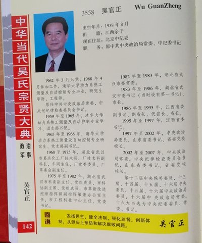 吴官正简介】出生年月:1938年8月,祖籍:江西余干,现在住址:北京中纪委,职务:原中共中央政治局常委、中纪委书记。