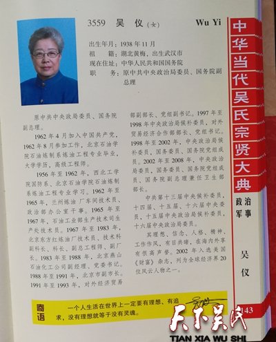 吴仪简介】出生年月:1938年11月,祖籍:湖北黄梅,出生武汉市,现在住址:中华人民共和国国务院,职务:原中共中央政治局委员、国务院副总理,原中共中央政局委员、国务院副总理。
