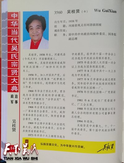 1994年退休。吴桂贤是中共第九、十、十一届中央委员,第十届中央政治局候补委员。弘扬至德文化,为中华复兴作贡献。