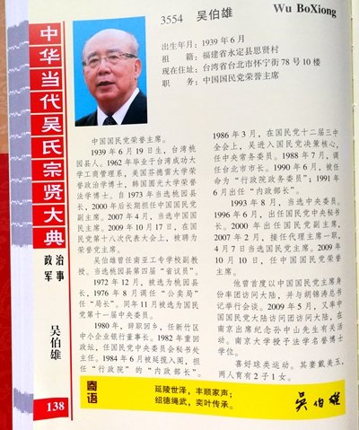 【吴伯雄简介】出生年月:1939年6月 祖籍:福建省永定县思贤村,现在住址:台湾省台北市怀宁街78号10楼,职务:中国国民党荣誉主席。