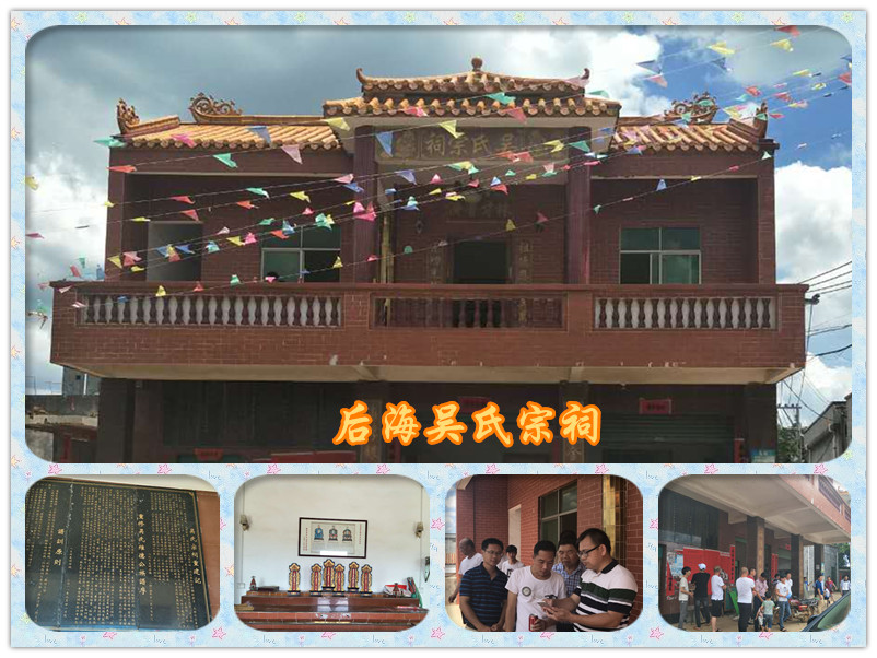 上午11:00,徐闻吴氏代表团抵达和安后海村,参观了吴氏宗祠,查看了吴氏宗谱,交流该宗支寻根问祖情况。据了解,后海村是省级卫生村,总人口1600人,320户,村民大多数姓吴。后海吴氏肇基祖为吴维德,据碑文记载,清代康熙末年维德公迁居此地,已传12代。而维德公从何处迁来,其以上世系待考。该支系字辈为:维应芝祖、进广家开、兴建作业、培泽良才、为国争光。