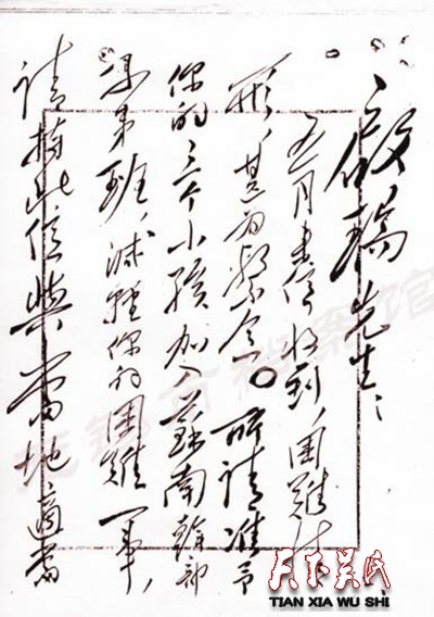 在无锡市档案馆工作人员的帮助下,记者见到了这封主席回信(复制件)。毛主席用的是“中央人民政府人民革命军事委员会”的信笺,来信一共写了三页,字体是人们所熟悉的毛体草书。记者注意到,就连信封上的寄信地址,都是毛主席亲笔写下:无锡市大成巷四号。信的内容如下: