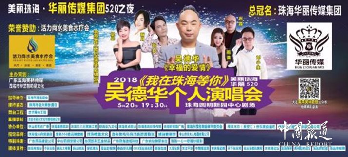 中国报道讯(吴蜀丰珠海报道)盛况空前的2018年“我在珠海等你”吴德华珠海个人演唱会5月20日晚在珠海市圆明新园中心剧场圆满落幕,华语原创歌手吴德华、滨海笑林剧组艺员、华丽传媒旗下艺员等知名歌手演唱会现场连续嗨唱,精彩纷呈。