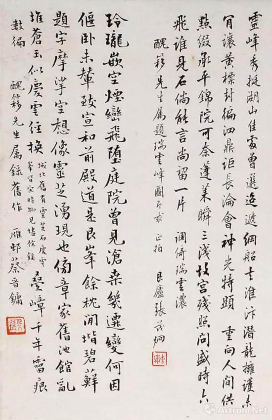 3. 灵峰秀挺,湖山佳处曾选。迢递网船书淮汴。潜龙拥护,未肯让、 黄标封徧。泗鼎讵长沦,会神光特顕。重向人间,供点缀、承平锦院。 可奈蓬莱瞬三浅。故宫残照,问盛时、□飞谁见。石倘能言,尚留一片。 调倚瑞云浓。 丑移先生属题瑞云峰图即求。根庐张茂炯。钤印:中清