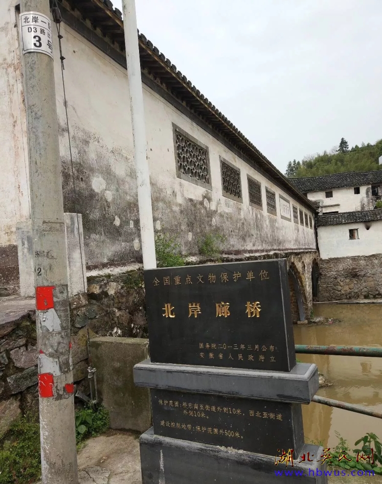 北岸吴氏宗祠位于歙县北岸村,始建于清代(1826年),距今已有近200年。祠堂为三间三进。门厅为五风楼,八字墙须弥座石刻与房檐下的砖雕、博逢板木雕都极其华美。中进享堂月报梁、金柱粗硕宏大。檐柱前有“黟县青”石栏。望柱头刻石狮,栏板上镌刻杭州西湖风景,洗练精致。寝殿台基前立石栏,刻“百鹿图”通景,群鹿隐现于山林,千姿百态,栩栩如生。中进后廊天井栏杆,由13块方栏板组成。望柱上饰石狮,栏板上镌刻礼器,极其工丽。在下面,为蓄水池。寝殿右侧的墙上置一砖雕神龛,三间殿宇式雕作细腻。左侧墙上,竖嵌修祠碑记一方。看罢祠堂,又带着我们参观历史悠久的北岸廊桥。这座棉溪河上的廊桥又名风雨桥,建于清中期。是徽州廊桥中最壮观的一座。具说是本地一个吴氏先人所建。桥长33米,宽4·7米,高6米。桥廊为砖木结构,高约5米。桥廊在墙的东西两面,装饰各有千秋。东侧辟有8个大型方窗,窗花均以砖砌成龟纹或梅花图案。西侧则辟花窗,窗孔镂空造型为满月、为古瓶、为树叶、为葫芦。廊桥的南端开有对称大门,均有厚木巨门开关。南端门额书“乡贤里”,侧书“西流毓秀”四字。北端门额书“谦庵旧址”。吴老对廊桥上的每个窗,每副画都了如指掌,让我们对他丰富的民俗知识啧啧称赞。