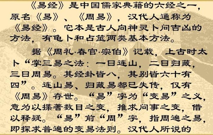 《易经》由本文的“经”和解说的“传”构成。“经”由六十四个用象征符号(即卦画)的卦组成,每卦的内容包括卦画、卦名、卦辞、爻题、爻辞组成。爻,卦画的基本单位为“爻”,爻分奇画与偶画,奇画由一条长的横线而成“—”,俗称“阳爻”;偶画是以两条断开的横线而成“--”,俗称“阴爻”。每一卦从最底层数起,总共有六爻,六爻以不同的奇画偶画配搭,形成八八六十四种不同的组合。按易天地人三才观,初、二爻代表地,奇画为刚偶画为柔,三、四爻代表人,奇画为义偶画为仁,五、上爻代表天,奇画为阳偶画为阴。所以用“阳爻”“阴爻”称谓奇画与偶画,是泛阴阳论的表现。卦画(卦的符号),即由六条“—”“--”奇偶画爻组成。卦名,顾名思义即前面卦画之名,如“坤”“复”“既济”等。卦辞,在卦名后,对六爻的综合总结,如“元亨利贞”,“同人于野,亨。利涉大川,利君子贞”等。爻题,即爻位名称,表示某一爻在六爻中的具体位置及奇偶画性质,六爻卦位自下而上数起,分别为初(即一)、二、三、四、五、上(即六)。“—”为九,“--”为六。如“初六”“九三”“六五”“上九”等。爻辞,指单条爻的说明、描述文辞,一卦有六爻,故共有六条爻辞,如“九二,见龙在田,利见大人。”同一卦六条爻辞间相对独立、相对静止但又相互关联、相互作用,表示不同时间、阶段事物的发展状态,以构成完整的发展、发生过程即全卦六爻整体内容总结—卦辞。上卦与下卦和内卦与外卦,因六十四卦最初由三爻八经卦重之演变而成:“八卦成列,像在其中矣;因而重之,爻在其中矣。”所以六爻卦亦可以分解为上半部分和下半部分,四、五、上为(上卦)或“外卦”,初、二、三为“下卦”或“内卦”。如“复”卦,上“地”下“震”,内“震”外“地”,“谦”卦为“坤”上“艮”下,内“艮”外“坤”。周易古经古经分篇,《周易》古经分为上下两篇,上篇三十卦,下篇三十四卦,共六十四卦,每一卦六爻,共三百八十四爻。卦的构成 卦符构成。《周易》每一卦有六爻,即六个符号组成,六个符号由两部分组成,即上卦和下卦,上卦和下卦分别取八卦中的某一卦。何为八卦?八卦指乾,坤,震,巽,坎,离,艮,兑。为了记住这八卦的符号,古人总结了顺口溜:乾三连 坤三断 震仰盂 艮覆碗 离中虚 坎中满 兑上缺 巽下断八卦符号两两相重,构成了《周易》六十四卦卦画,8×8=64。为了区分八卦之卦和六十四卦之卦,古人称八卦为“经卦”。称六十四卦为“别卦”。因此,任意两个经卦相重叠可以得一别卦。六十四卦是由八经卦相重而成。故从卦画看,一别卦由两经卦组成:居下部分称内卦(又称下体),另一部称外卦(又称上体)。由于八卦相重成六十四卦,故往往用八卦卦象称呼六十四别卦。八卦最基本的象是八种自然物:乾为天、坤为地、震为雷、巽为风、艮为山、兑为泽、坎为水、离为火。为了记住六十四卦卦象,以两个经卦卦象称呼一别卦。如天地否即看成由天地组成的卦画称为否卦。天山遁可看成由天山组成的卦画可称为遁卦。