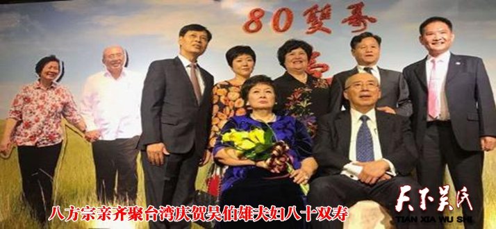 天下吴氏讯(特约采编 吴乐一 吴惠章)据中国台湾桃园吴惠章发来的消息,2018年6月19日下午,吴璧玲、吴志扬、吴志刚姐弟在台北福容饭店芙蓉厅隆重举行中国国民党前主席吴伯雄宗贤与夫人戴美玉八十双寿祝寿活动。来自台湾各界的亲朋好友,欢聚一堂。还有世吴第二届主席吴良民宗长,莞吴会永远名誉会长吳銘煜宗长,厦门市吴氏文化研究会会长吴国荣博士,海峡两岸吴氏一家亲群主吴淑珍出席,还有台湾与大陆各宗亲会代表参加。