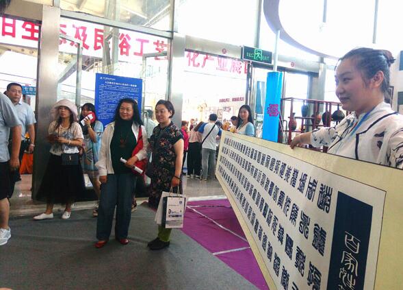 6月17日,哈洽会文化产业展厅绥化展区,海伦的巨幅剪纸作品《百家姓》一亮相,就受到参展各界人士追捧,纷纷讨价并与其合影留念,场面热烈。记者徐文革摄