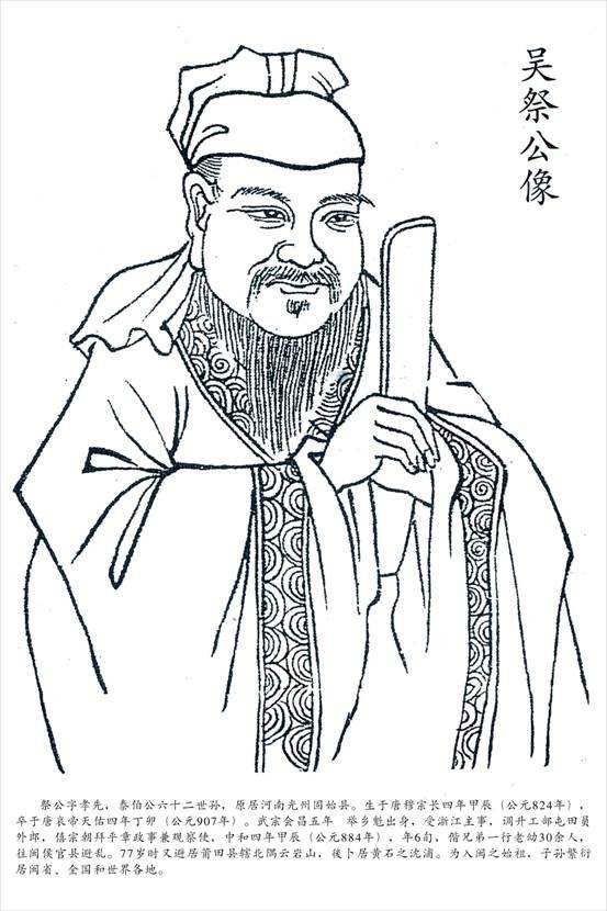 吴祭,原籍河南固始县,是吴姓最早进入福建的人,系唐代工部屯田员外郎,平章政事兼观察使,定居莆田后潜心办学,开设书院,传播儒家思想和中原文化,并引导黎民开垦屯田,开沟挖渠,兴修水利,广种五谷,遍植林果,是最早开发莆田的先贤之一。宋丞相陈俊卿慕其盛名,赞其“大哉儒宗,百世仰止 ”。