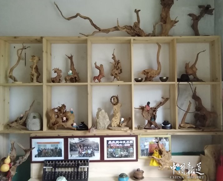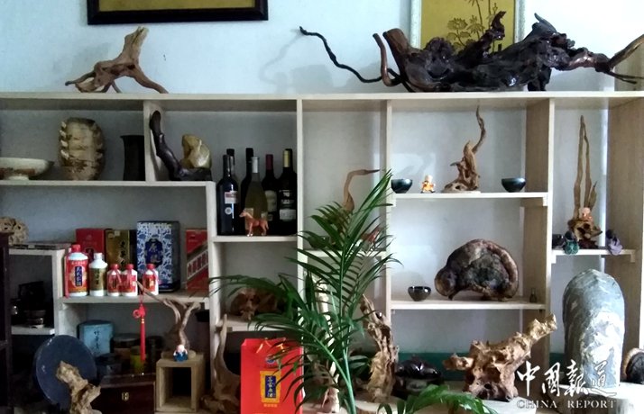 吴府的主人吴汉帝告诉记者,除了种茶和吴氏商会的事,根雕是他的最爱之一,吴汉帝说,根雕是中国传统雕刻艺术之一,是以树根(包括树身、树瘤、竹根等)的自生形态及畸变形态为艺术创作对象,通过构思立意、艺术加工及工艺处理,创作出人物、动物、器物等艺术形象作品。