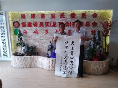 吴建华会长代表福建省吴氏委员会、福建省吴氏宗亲总会亲自撰联并题写的对联(天上有口言守信,口下是天志凌云)给永定吴氏宗亲会。