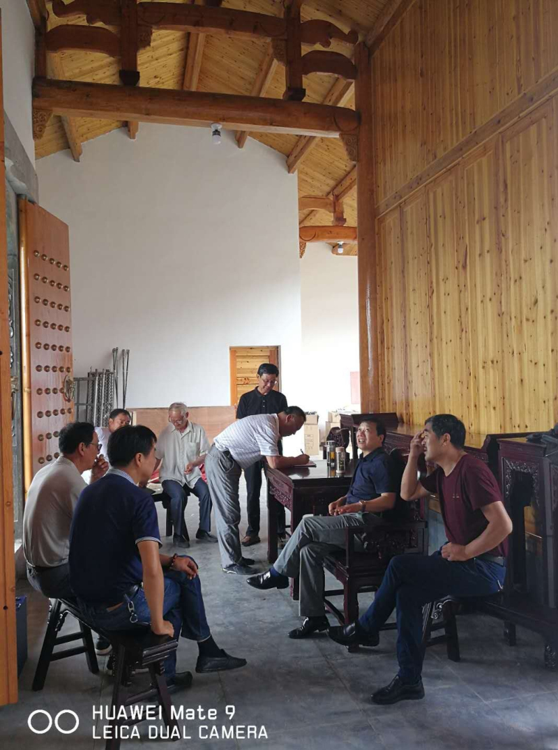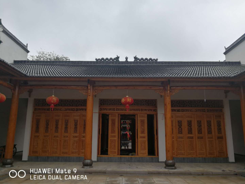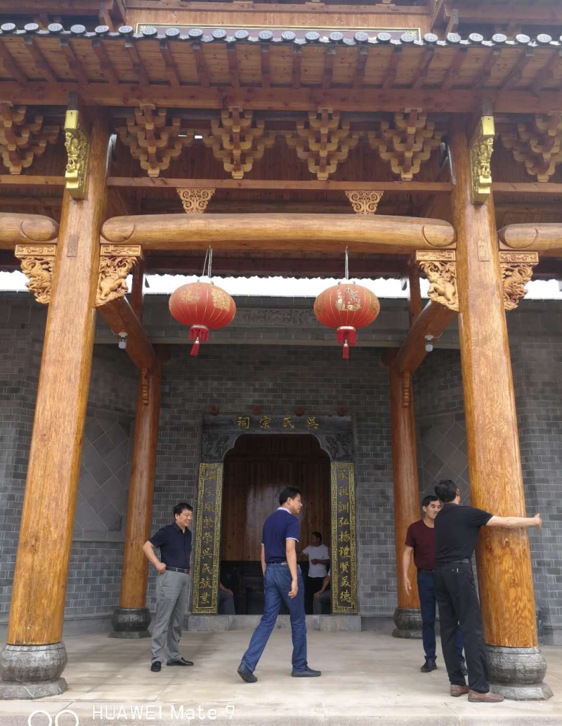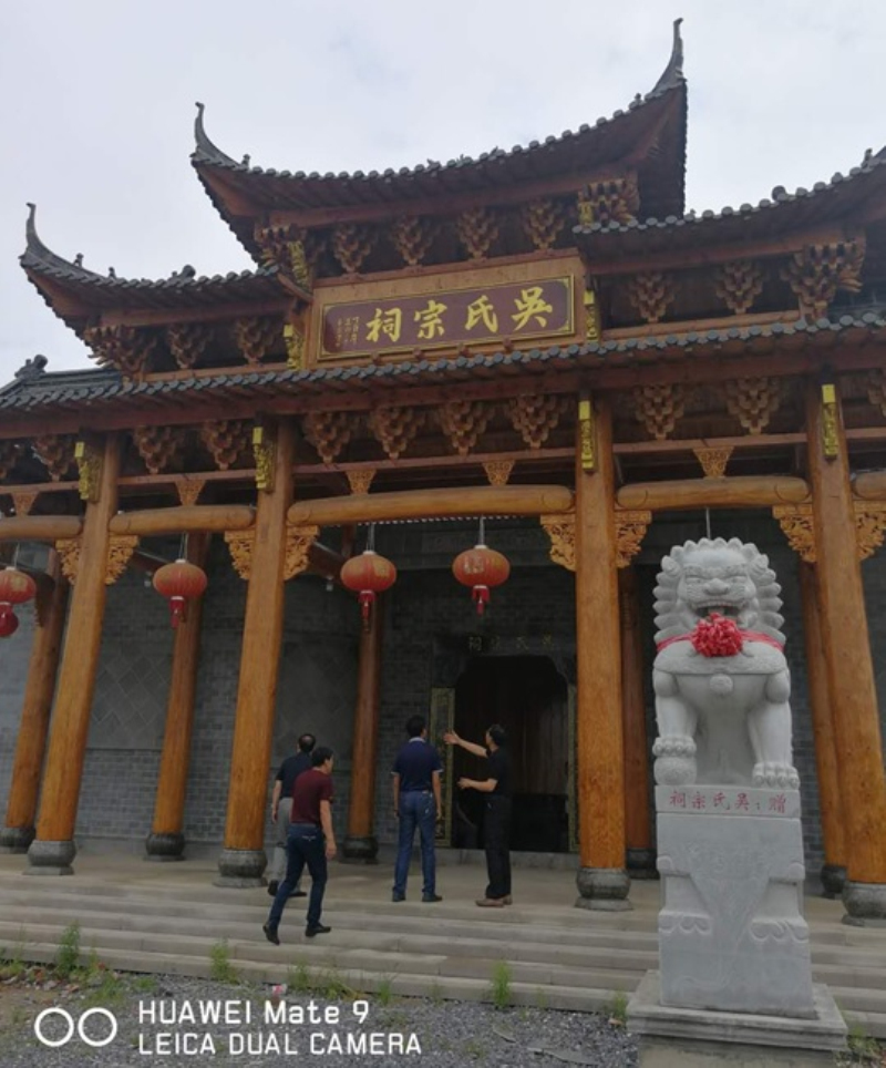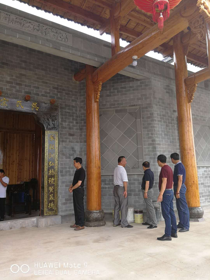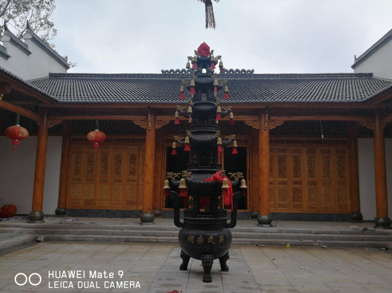 已涂刷完清漆的宗祠门梁柱、装修好的两边回廊、中殿及院落、后殿大厅。粉墙黛瓦的微式建筑风格,建筑面积近千平米。虽说是三进,可那庄严、精致仍不失为一大特色,合抱粗的松木柱梁,外门两旁徴派特色的砖雕技术与根雕之乡的工艺完美结合,均来自永华宗长的高超技术监理和指导。二殿院落中间,摆放着铸有芜湖铸造字样的、吴家女婿魏氏捐赠的两米多高的香炉,衬托着中殿更加气势恢宏。两边回廊布局相当合理、玲珑小巧,给人以耳目一新之感。拜访组一行,边走边看,不时驻足询问。陪同的宗亲对设计投标、材料采购、施工、质量、进度、安全、资金筹措等一一作了介绍。一千平米的建筑面积,足足花了40多分钟。