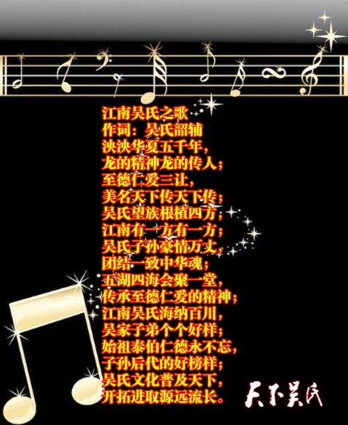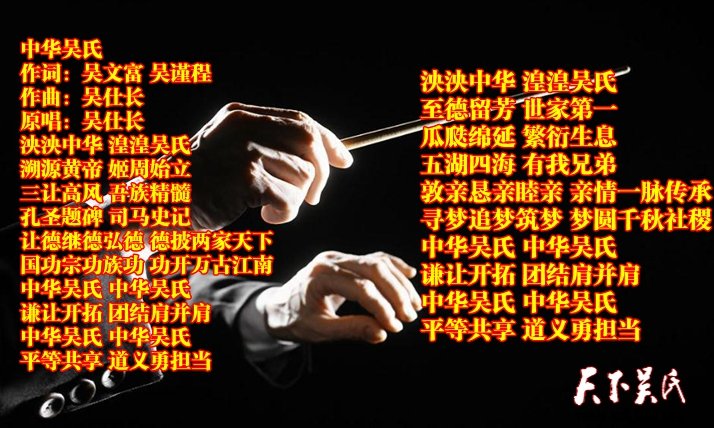 中国报道讯(吴蜀丰报道)数千万吴氏儿女都在传唱这九首吴氏之歌,每首歌都是一部历史,每行歌词都是一篇完美的故事,这些歌词让人铭记不忘,如“三让天下孔子赞,世家第一史记铭。”“让德继德弘德,德披两家天下。”“国功宗功族功,功开万古江南。”“至德留芳,世家第一。”“天上有口言守信,口下是天志凌云。”“吴氏先祖,仁爱谦让,天下颂扬。”“吴氏望祖,枝繁叶茂,根植四方。”“吴氏后裔,名人辈出,青史辉煌。”“与国与家心坦荡,忠孝礼仪放光芒。”