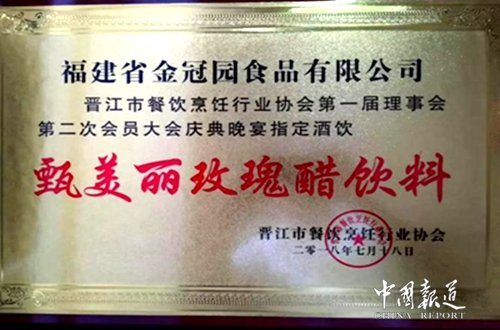 金冠园集团为此次大会指定礼品赞助商,"甄美丽玫瑰醋饮料”为大会指定饮料,由于公司热心公益事业荣获“爱心公益企业”的称号。