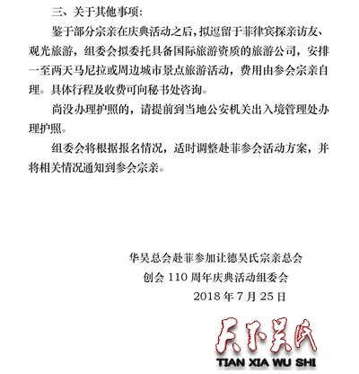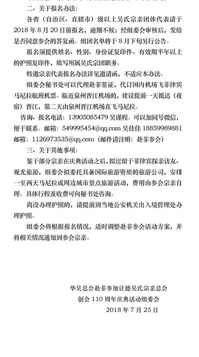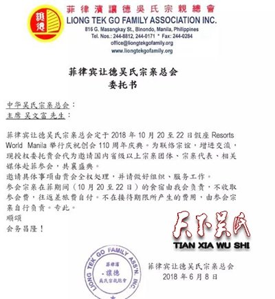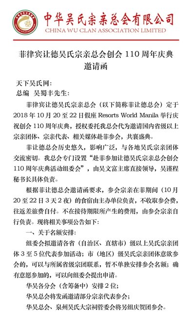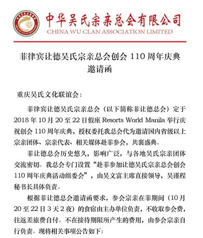 天下吴氏讯(吴蜀丰 )吴氏又一特大盛会将于2018年10月下旬在菲律宾召开让德吴氏宗亲总会110周年庆典大会,诚邀天下吴氏宗亲参加。金秋十月,相约菲律宾,有你更精彩!