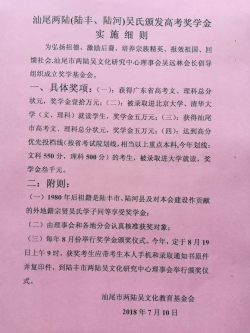 汕尾两陆(陆丰、陆河)吴氏颁发高考奖学金实施细则