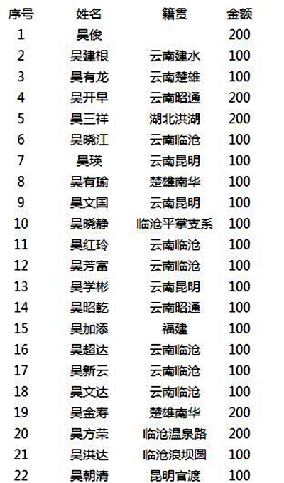 最后,再次感谢有龙宗长、建根、开早、三祥、昭乾、超达、方荣、锋志等所有宗亲!感谢你们的关怀!感恩吴氏的团结和大爱!让我们一起愿老爷子一路走好!让我们一起为云南吴氏贡献自己的力量!
