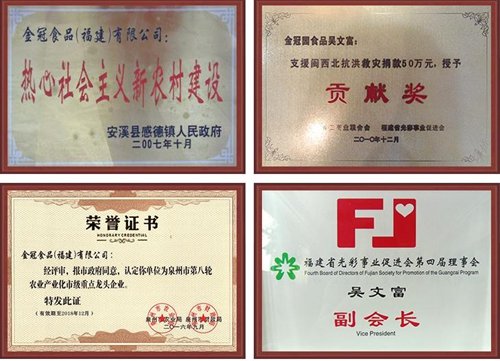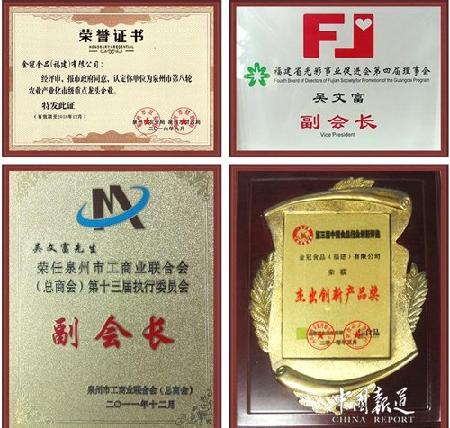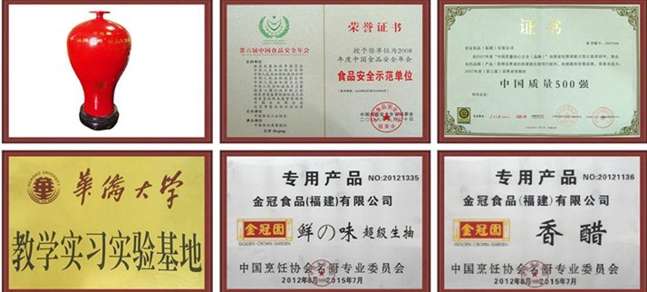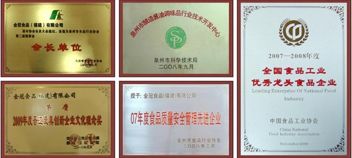 历年来,企业通过S09001国际质量管理系认证, HACCP食品安全管理体系认证,1S014001环境管理体系认证,CIQ出口卫生注册美国FDA认证和QS认证,严格品质管理,注重品牌建设,“金冠园牌先后荣获“中国驰名商标”、“中国星火计划项目”、“全国食品工业龙头食品企业”、“福建省星火行业技术新中心”、“食品卫生A级单位”,“质量稳定产品”、“质量第一,诚信经营企业”、“市先进单位”、“守合同、重信用企业”、“品牌泉州公众印象奖”等荣誉称号。产品畅销全国各地并大量出口,深受广大消费者青睐。