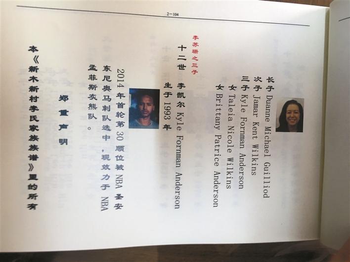 一边人讲着客家话,一边人讲着英语,亲人相见,有着说不完道不尽的话语。最后,李天平代表李氏家族向安德森赠送了李氏家谱,表示正式接纳了这位亲人,并在扉页上写下了“欢迎回家”的中文字。凯尔·安德森向这位年长的表哥赠送了自己效力于马刺队的一件签名球衣。
