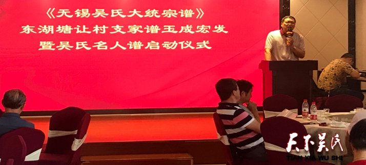 贵州省吴氏宗亲总会吴学强会长、无锡市吴文化研究会、泰伯吴氏祖地宗亲联谊总会、无锡吴氏祖地宗亲会、无锡市图书馆、无锡市谱谍文化研究会、常州吴氏宗亲会、延陵季子宗亲会、张家港吴氏宗亲会、宜兴济美堂吴氏宗亲会等宗亲代表一百五十余人参加了此次东湖塘让村家谱宏发玉成暨吴氏名人谱启动仪式。